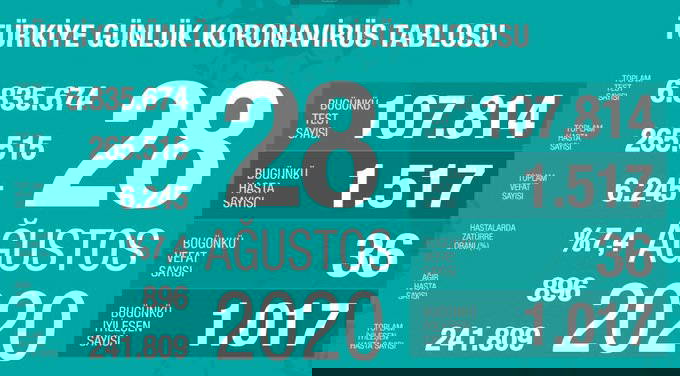 Türkiye'nin 28 Ağustos 2020 koronavirüs tablosu şöyle: