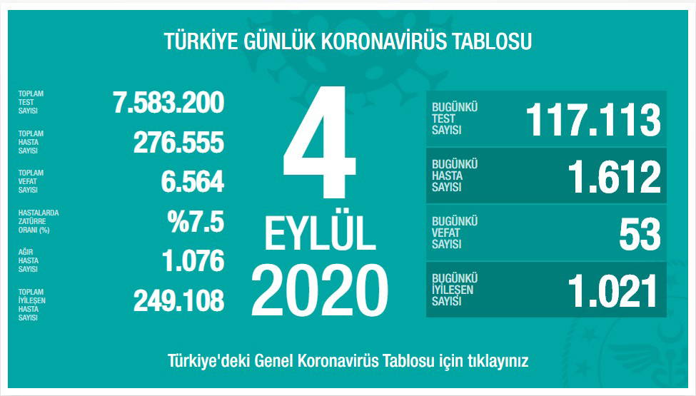 Türkiye'nin 4 Eylül 2020 koronavirüs tablosu şöyle: