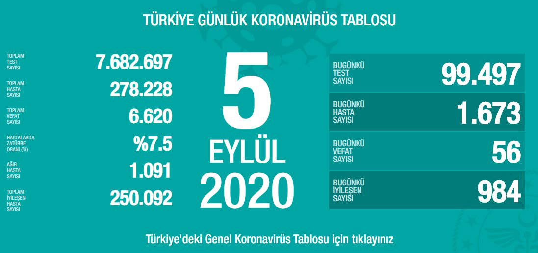 Türkiye'de yeni enfekte olanların sayısı bin 673 olarak belirtilirken, iyileşenlerin sayısı 984 olarak ifade edildi.