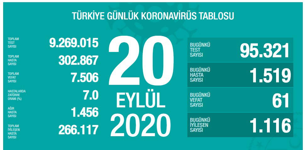 Türkiye'nin 20 Eylül 2020 koronavirüs tablosu şöyle: