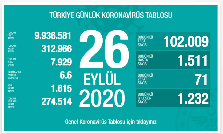 Son 24 saatte yaşamını yitiren kişi sayısı 71 olurken, iyileşen sayısı da bin 232 oldu. Ağır hasta sayısı ise tabloda bin 615 olarak açıklandı.