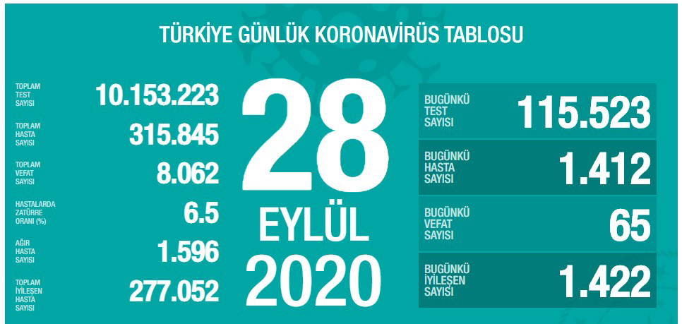 Türkiye'nin 28 Eylül 2020 güncel koronavirüs tablosu şöyle: