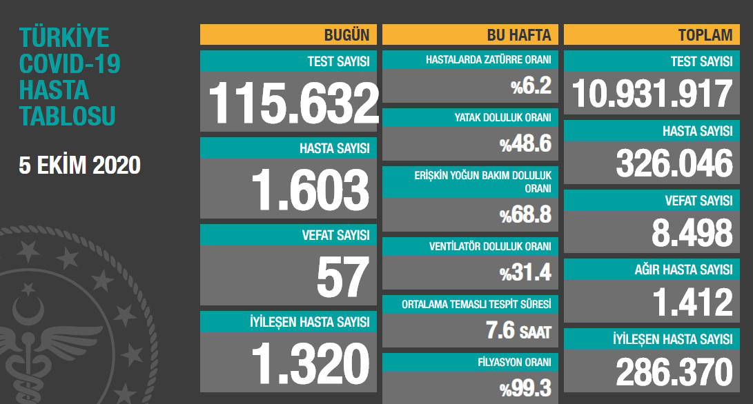 Sağlık Bakanı Koca, güncel verileri açıkladı. Koca'nın açıkladığı verilere göre son 24 saatte 57 yurttaş yaşamını yitirdi, bin 320 kişi de iyileşti. Yeni hasta sayısının bin 603 olarak ifade edildiği tabloda ağır hasta sayısının bin 412 olduğu açıklandı.