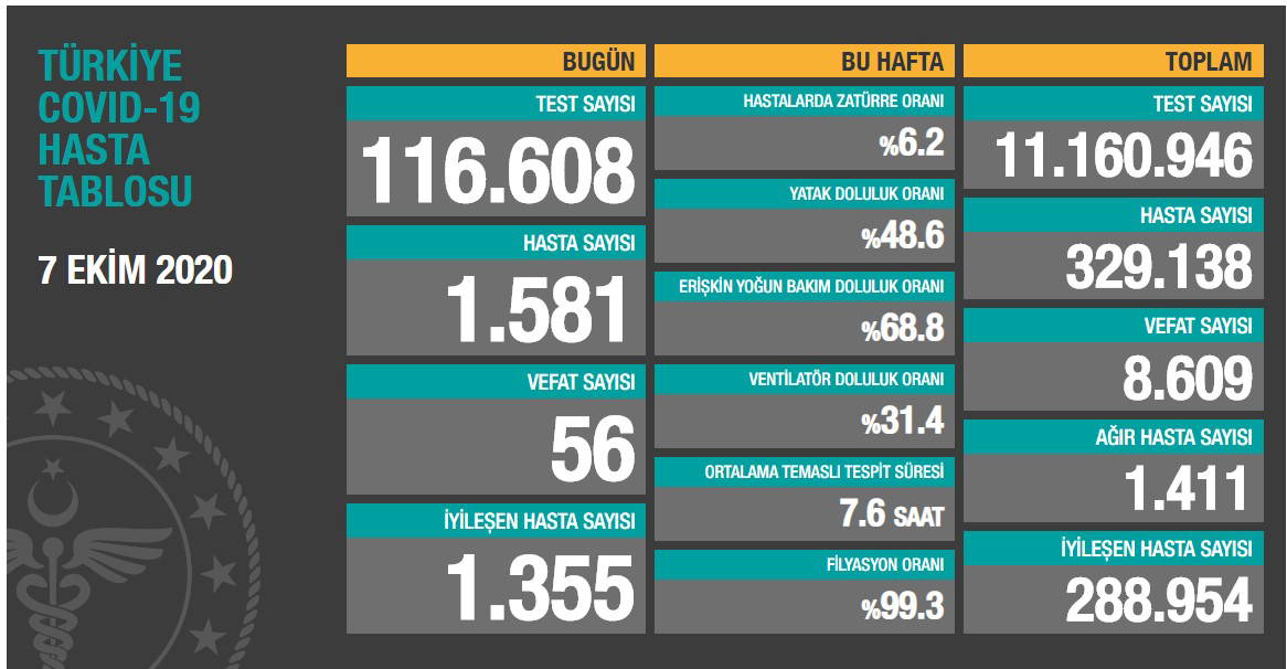 Türkiye'nin 7 Ekim 2020 güncel koronavirüs tablosu şöyle: