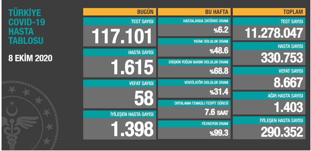 Sağlık Bakanı Fahrettin Koca'nın açıkladığı koronavirüs tablosuna göre son 24 saatte 58 yurttaş yaşamını yitirdi. Hasta sayısının ise bugün bin 615 olduğu ifade edildi.