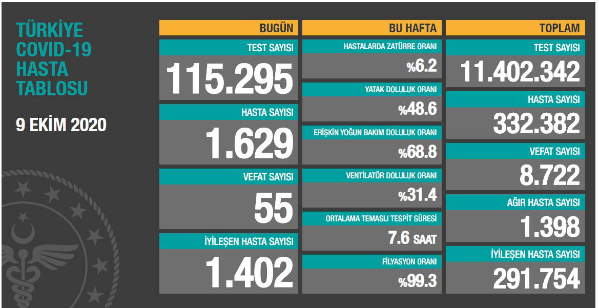 Türkiye'nin 9 Ekim 2020 güncel koronavirüs tablosu şöyle:
