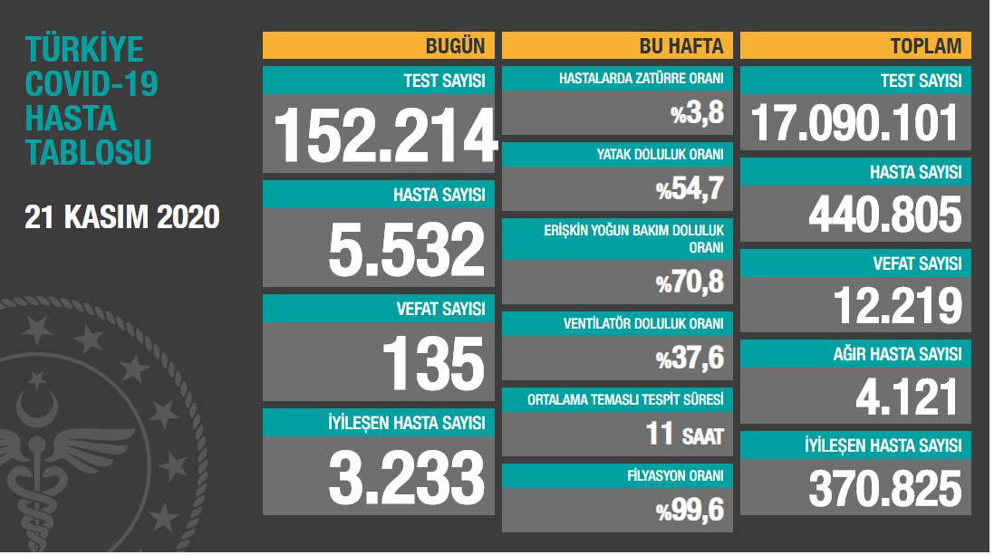 Sağlık Baknaı Koca, güncel verileri açıkladı. Açıklanan verilere göre, son 24 saatte 135 yurttaş salgın nedeniyle yaşamını yitirirken, 5 bin 532 hasta sayısı kaydedildi.