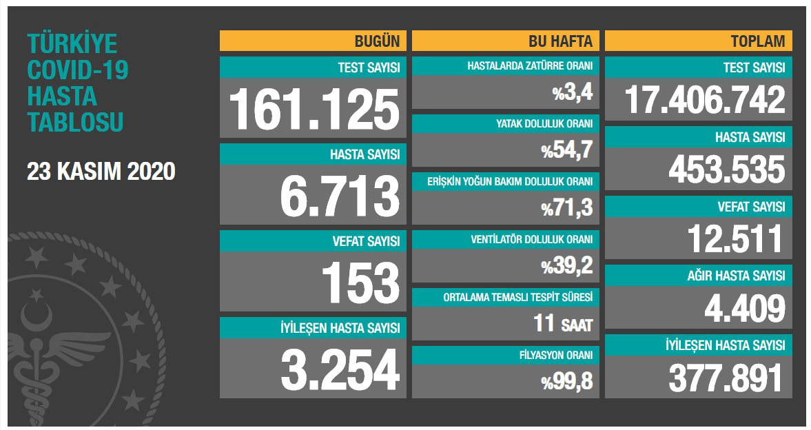Türkiye'nin 23 Kasım 2020 güncel koronavirüs tablosu şöyle: