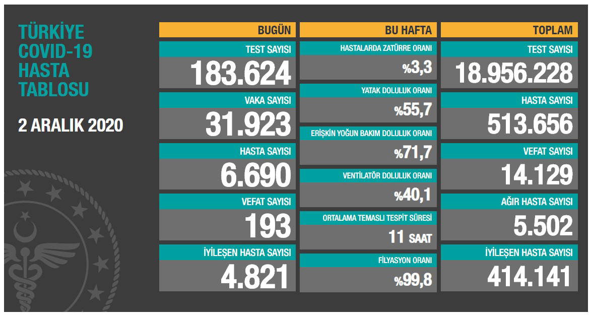Türkiye'nin 2 Aralık 2020 güncel koronavirüs tablosu şöyle: