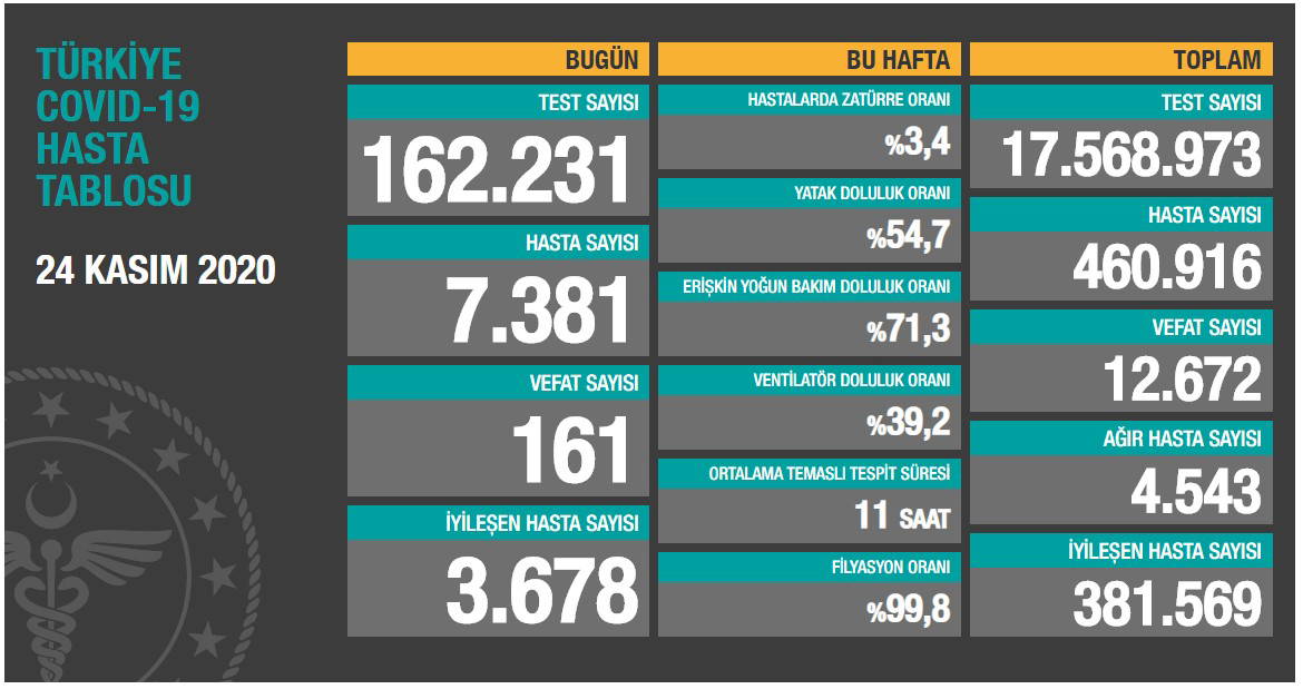 Türkiye'nin 24 Kasım 2020 güncel koronavirüs tablosu şöyle: