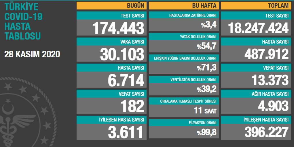 Türkiye'nin 28 Kasım 2020 güncel koronavirüs tablosu şöyle: