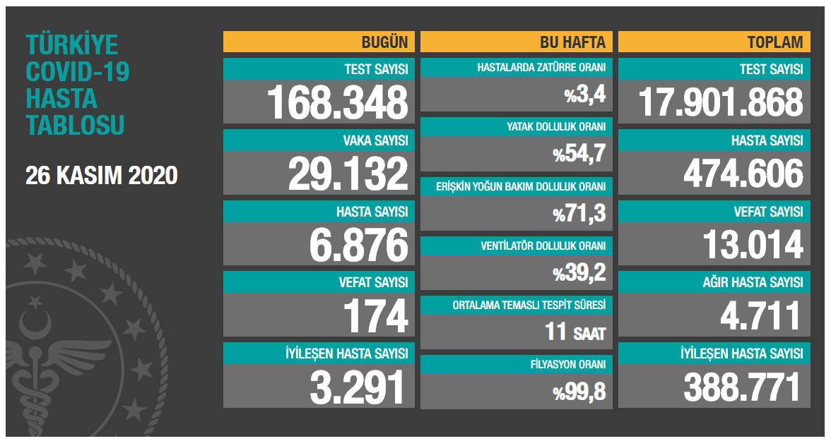 Türkiye'nin 26 Kasım 2020 güncel koronavirüs tablosu şöyle: