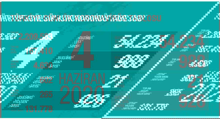 Bugün kaydedilen yeni 988 vakayla birlikte Türkiye'deki toplam vaka sayısı da 167 410'a yükselmiş oldu.