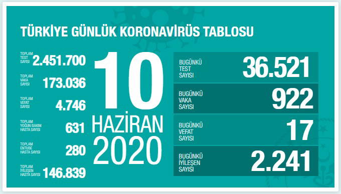 Koca, Türkiye'de koronavirüs nedeniyle 17 yurttaşın daha yaşamını yitirdiğini açıkladı. Bakan Koca, ayrıca yaptığı açıklamada 922 yeni vakanın tespit edildiği bilgisini verdi. Koronavirüs nedeniyle 4 bin 746 kişi yaşamını yitirirken, koronavirüs vaka sayısı 173 bin 036'a yükseldi. Bugün iyileşen sayısı 2 bin 241 oldu.