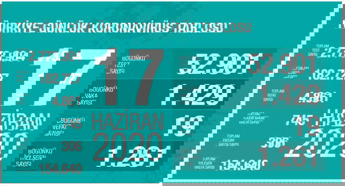 Sağlık Bakanı Fahrettin Koca, 19 yurttaşın daha koronavirüs salgını nedeniyle yaşamını yitirdiğini ve testi pozitif çıkan bin 429 yeni vakanın olduğunu açıkladı. Koronavirüs nedeniyle 4 bin 861 kişi yaşamını yitirirken, koronavirüs vaka sayısı 182 bin 727'e yükseldi. Bugün iyileşen sayısı bin 261 oldu.