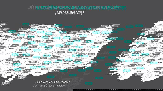 Bakan Koca'nın paylaştığı Türkiye haritası üzerinden yayımlanan verilere göre, illerin her 100 bin kişide haftalık (20-26 Şubat) Covid-19 vaka sayısı şöyle: