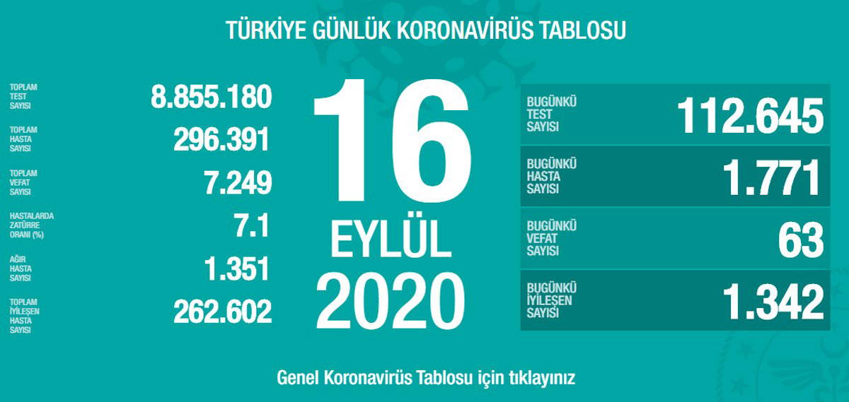 Koca, ''Son 24 saatte 112 bin 645 test yapıldı. Bin 771 kişide daha koronavirüs tespit edildi. Tedavi görenlerden 63 kişi hayatını kaybederken, bin 342 kişi de iyileşti. Bugünkü verilerle, toplam test sayısı 8 milyon 855 bin 180, toplam hasta sayısı 296 bin 391, toplam vefat sayısı 7 bin 249,  hastalarda zatürre oranı yüzde 7,1, ağır hasta sayısı bin 351, toplam iyileşen hasta sayısı 262 bin 602 oldu'' açıklamasını yaptı.
