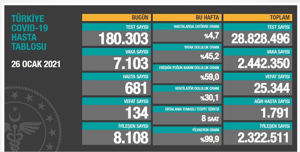 Türkiye'nin 26 Ocak 2021 günlük koronavirüs tablosu şöyle: