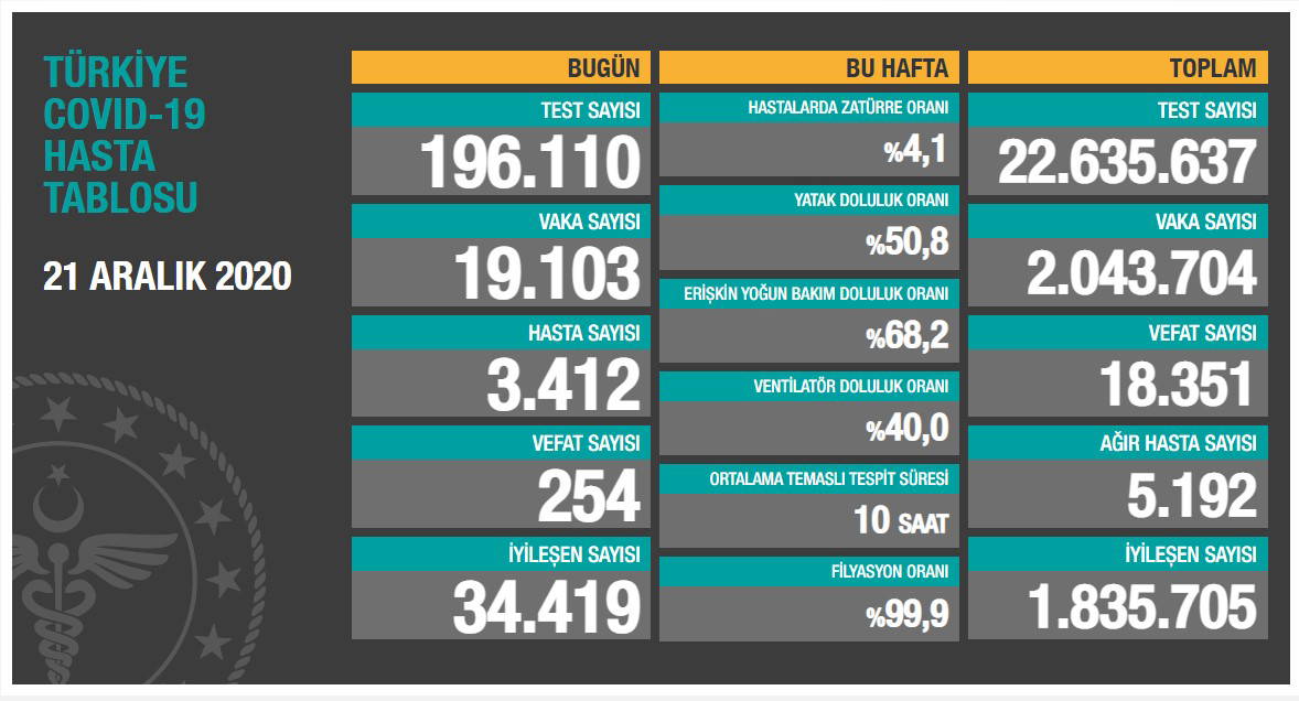 Türkiye'nin 21 Aralık 2020 koronavirüs tablosu şöyle: