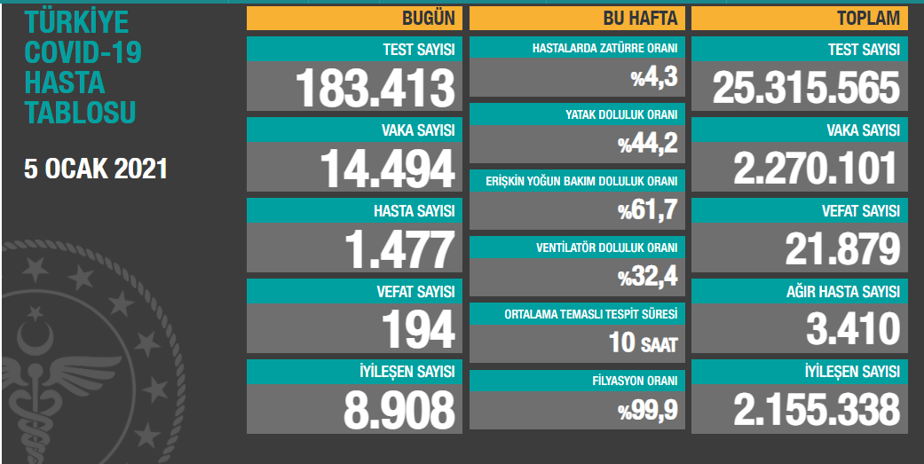 Türkiye'nin 5 Ocak 2021 güncel koronavirüs tablosu şöyle: