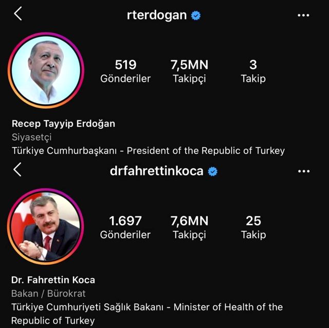 Erdoğan'ın Instagram'da 7.5 milyon takipçisi bulunurken, Fahrettin Koca'nın ise 7.6 milyon takipçiye yükselmesi dikkat çekti.