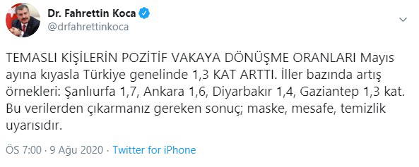 Koca yaptığı açıklamada, "Temaslı kişilerin pozitif vakaya dönüşme oranları Mayıs ayına kıyasla Türkiye genelinde 1,3 KAT ARTTI. İller bazında artış örnekleri: Şanlıurfa 1,7, Ankara 1,6, Diyarbakır 1,4, Gaziantep 1,3 kat. Bu verilerden çıkarmanız gereken sonuç; maske, mesafe, temizlik uyarısıdır" dedi.