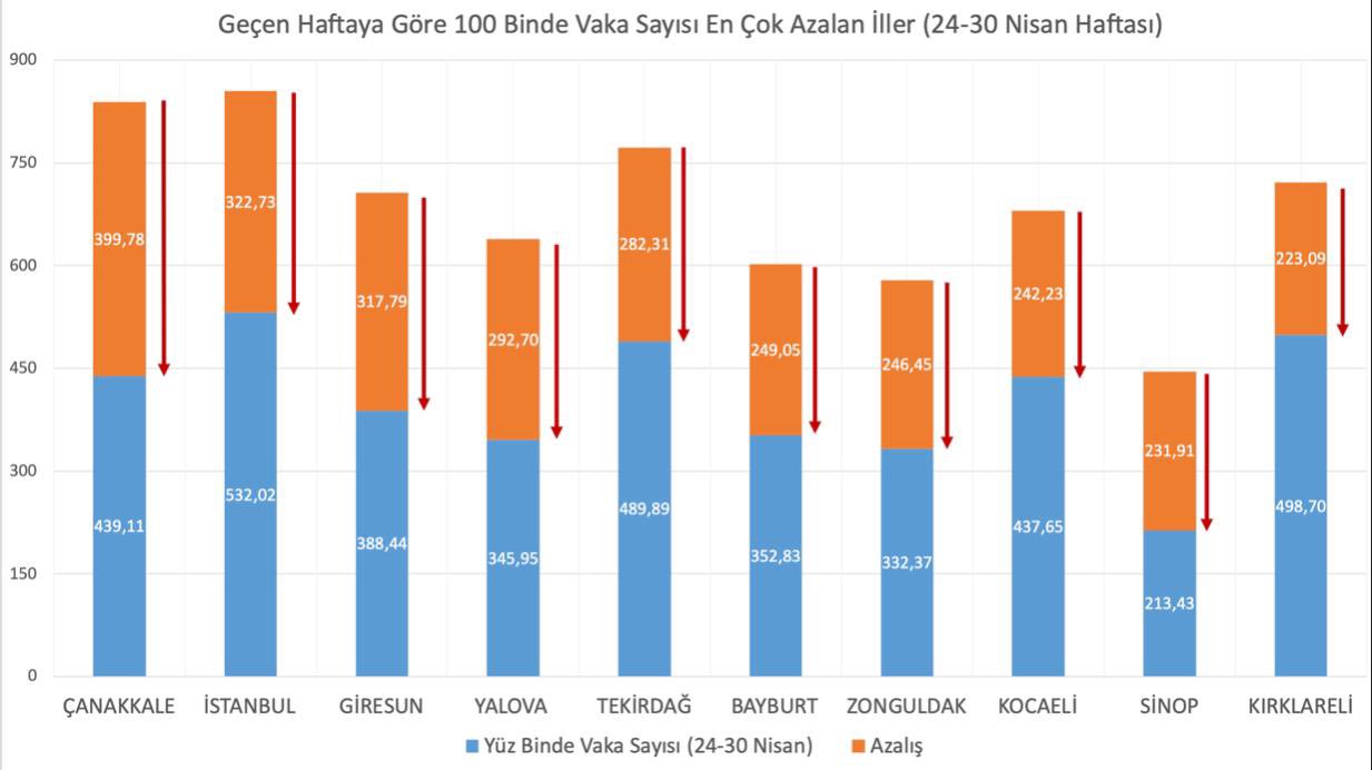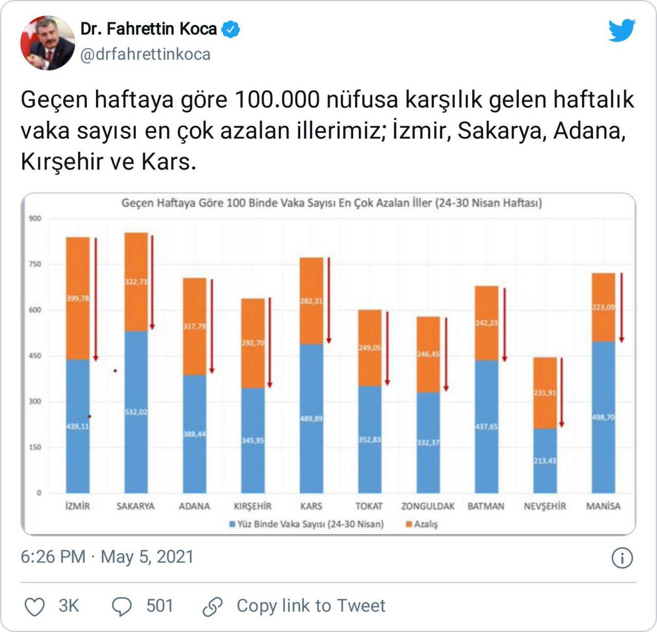 Koca yaptığı açıklamada, "5 Mayıs 2021 tarihinde paylaştığım grafikte il adları grafiklere yanlış olarak yerleştirilmiştir. Bu teknik hata Bakanlığımız kayıtlarındaki doğru hali yeniden düzenlenerek giderilmiştir. Grafiğin doğru halini ekte yeniden dikkatlerinize sunuyorum" dedi.