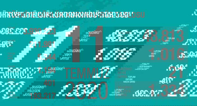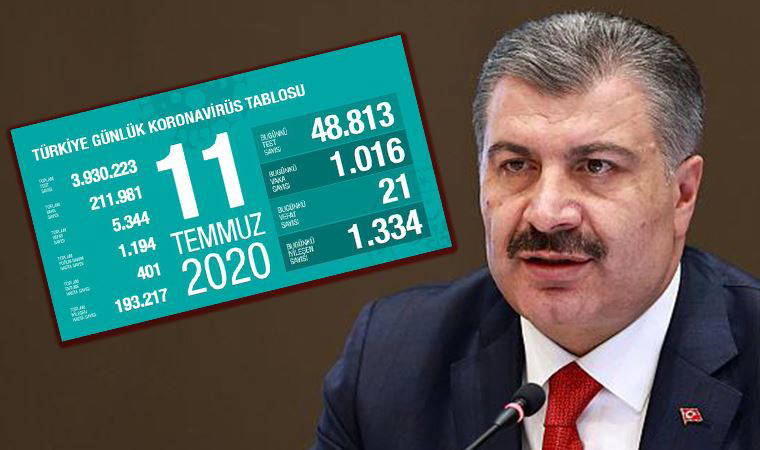Sağlık Bakanı Fahrettin Koca, Türkiye'de koronavirüs nedeniyle 21 yurttaşın daha yaşamını yitirdiğini açıkladı. Bakan Koca, ayrıca yaptığı açıklamada bin 16 yeni vakanın tespit edildiği bilgisini verdi. Koronavirüs nedeniyle 5 bin 344 kişi yaşamını yitirirken, koronavirüs vaka sayısı 211 bin 981'e yükseldi. Bugün iyileşen sayısı bin 334 oldu.