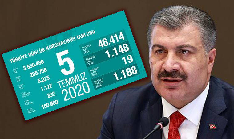 Sağlık Bakanı Fahrettin Koca, Türkiye'de koronavirüs nedeniyle 19 yurttaşın daha yaşamını yitirdiğini açıkladı. Bakan Koca, ayrıca yaptığı açıklamada bin 148 yeni vakanın tespit edildiği bilgisini verdi. Koronavirüs nedeniyle 5 bin 225 kişi yaşamını yitirirken, koronavirüs vaka sayısı 205 bin 758'e yükseldi. Bugün iyileşen sayısı bin 188 oldu.