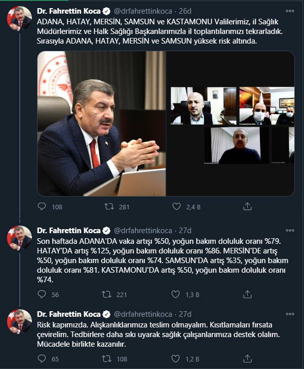 "Adana, Hatay, Mersin, Samsun ve Kastamonu Valilerimiz, il Sağlık Müdürlerimiz ve Halk Sağlığı Başkanlarımızla il toplantılarımızı tekrarladık. Sırasıyla Adana, Hatay, Mersin, Samsun yüksek risk altında.