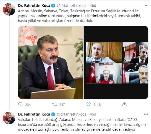 Bakan Koca, "Salgının bu illerimizdeki seyri, temaslı takibi, hasta yükü ve vaka artışları üzerinde durduk. Vakalar Tokat, Tekirdağ, Adana, Mersin ve Sakarya'da iki haftada yüzde 100, Erzurum'da ise yüzde 50 artış gösterdi. Tedbirlerden verdiğimiz her taviz, salgınla mücadeleyi zorlaştırıyor. Tedbirin olmadığı yerde tehdit devam ediyor" dedi.