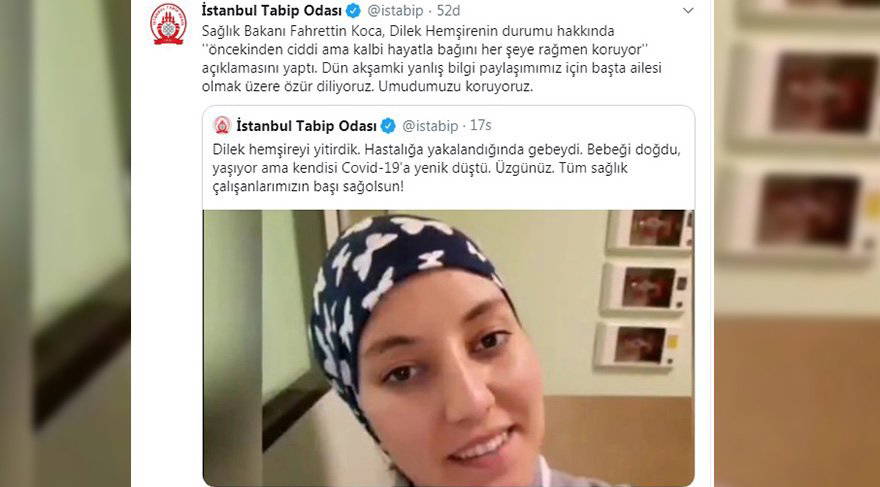 İstanbul Tabip Odası da dün twitter hesabı üzerinden koronavirüs nedeniyle Hemşire Dilek Akçabelen'in hayatını kaybettiğini duyurmuştu. Koca'nın paylaşımı üzerine İstanbul Tabip Odası 'Özür diliyoruz' paylaşımı yaptı.