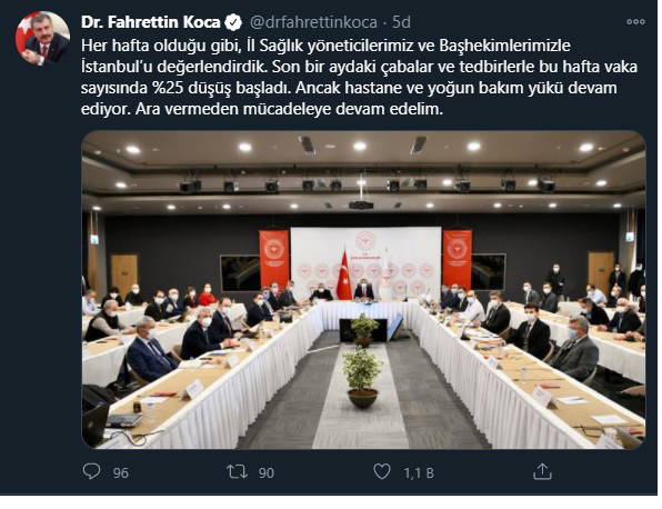"Her hafta olduğu gibi, İl Sağlık yöneticilerimiz ve Başhekimlerimizle İstanbul’u değerlendirdik. Son bir aydaki çabalar ve tedbirlerle bu hafta vaka sayısında %25 düşüş başladı. Ancak hastane ve yoğun bakım yükü devam ediyor. Ara vermeden mücadeleye devam edelim."