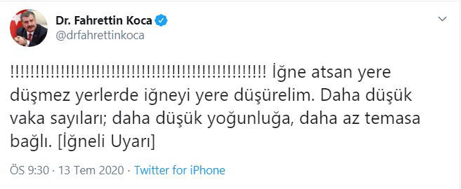 ''İğne atsan yere düşmez yerlerde iğneyi yere düşürelim. Daha düşük vaka sayıları; daha düşük yoğunluğa, daha az temasa bağlı. [İğneli Uyarı]''