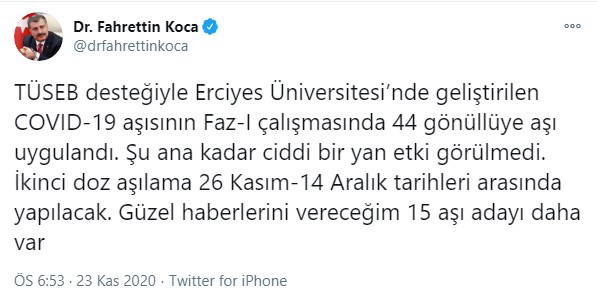 ''TÜSEB desteğiyle Erciyes Üniversitesi’nde geliştirilen Covid-19 aşısının Faz-1 çalışmasında 44 gönüllüye aşı uygulandı. Şu ana kadar ciddi bir yan etki görülmedi. İkinci doz aşılama 26 Kasım-14 Aralık tarihleri arasında yapılacak. Güzel haberlerini vereceğim 15 aşı adayı daha var.''