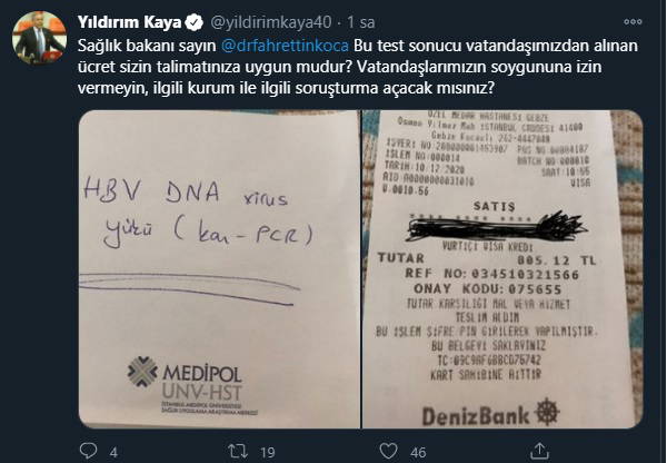 Yıldırım Kaya, sosyal medya hesabı üzerinden yaptığı paylaşımda, "Sağlık bakanı sayın @drfahrettinkoca Bu test sonucu vatandaşımızdan alınan ücret sizin talimatınıza uygun mudur? Vatandaşlarımızın soygununa izin vermeyin, ilgili kurum ile ilgili soruşturma açacak mısınız?" dedi.