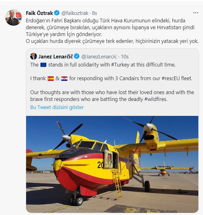 Erdpğan'ın bu sözlerine yanıt veren CHP Parti Sözcüsü Faik Öztrak, ''Erdoğan’ın Fahri Başkanı olduğu Türk Hava Kurumunun elindeki, hurda denerek, çürümeye bırakılan, uçakların aynısını İspanya ve Hırvatistan şimdi Türkiye’ye yardım İçin gönderiyor. O uçakları hurda diyerek çürümeye terk edenler, hiçbirinizin yatacak yeri yok'' diyerek yaşanan duruma tepki gösterdi.