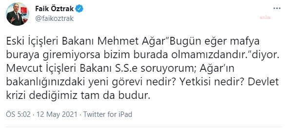 "Eski İçişleri Bakanı Mehmet Ağar 'Bugün eğer mafya buraya giremiyorsa bizim burada olmamızdandır' diyor. Mevcut İçişleri Bakanı S.S.e soruyorum; Ağar’ın bakanlığınızdaki yeni görevi nedir? Yetkisi nedir? Devlet krizi dediğimiz tam da budur."