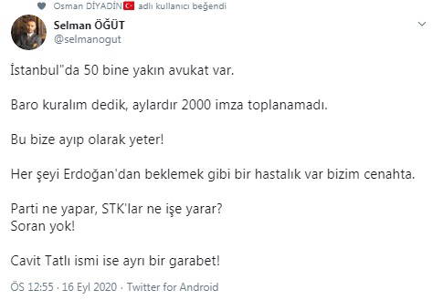 Sosyal medya hesabından paylaşımda bulunan AKP'deki "Pelikan" denen ekibin önde gelenlerinden olduğu iddia edilen İstanbul Medipol Üniversitesi Hukuk Fakültesi Öğretim Üyesi Selman Öğüt, “İstanbul’da 50 bine yakın avukat var. Baro kuralım dedik, aylardır 2000 imza toplanamadı. Bu ayıp bize yeter" demiş, itiraf niteliğindeki söz konusu paylaşım çok konuşulmuştu.
