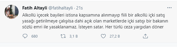 Bir tepki de gazeteci Fatih Altaylı'dan geldi. Altaylı sosyal medya hesabından yaptığı açıklamada şunları kaydetti: Alkollü içecek bayileri istisna kapsamına alınmayıp fiili bir alkollü içki satış yasağı getirilmeye çalışılsa dahi açık olan marketlerde içki satışı bir bakanın sözlü emri ile yasaklanamaz. İsteyen satar. Her türlü ceza yargıdan döner.