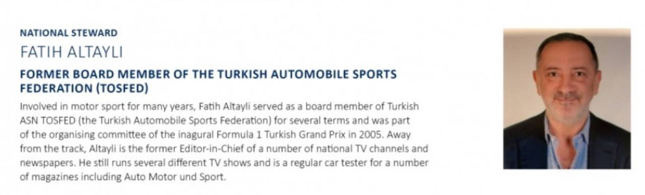 Sıralama turlarıyla yarın Türkiye’ye pistine geri dönecek olan Formula 1 için hakemler de açıklandı. Yarış hakemleri arasında deneyimli gazeteci Fatih Altaylı’nın da yer aldığı görüldü.