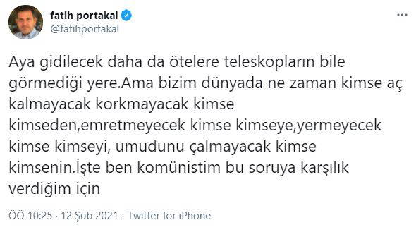 Gazeteci Fatih Portakal da Ay'a gitme tartışmalarına twitterında paylaştığı Nazım Hikmet'in şiiriyle dahil oldu