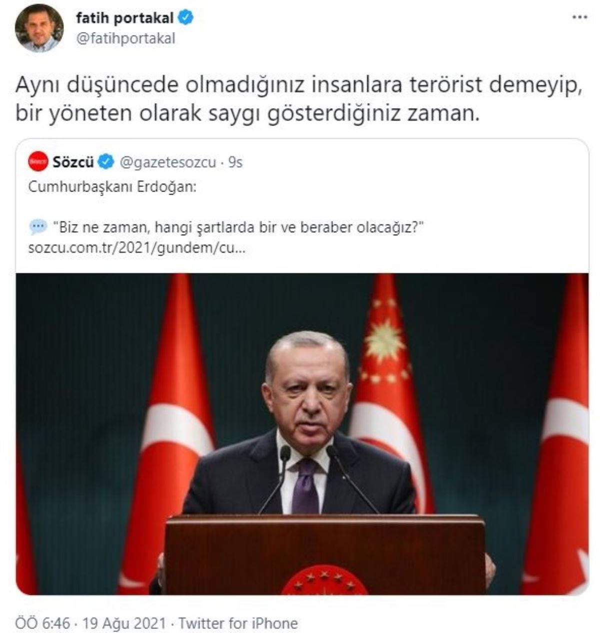 Portakal, Erdoğan’ın "Biz ne zaman, hangi şartlarda bir ve beraber olacağız?" ifadesini, “Aynı düşüncede olmadığınız insanlara terörist demeyip, bir yöneten olarak saygı gösterdiğiniz zaman” diye yanıtladı.