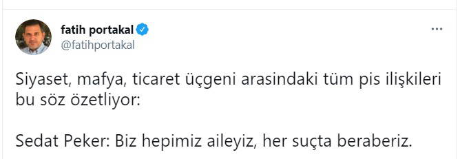 Sosyal medya hesabı üzerinden paylaşım yapan gazeteci Fatih Portakal, ''Siyaset, mafya, ticaret üçgeni arasindaki tüm pis ilişkileri bu söz özetliyor: Sedat Peker: Biz hepimiz aileyiz, her suçta beraberiz'' diyerek Peker'in sözlerine dikkat çekti.