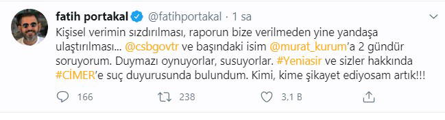Fatih Portakal, sosyal medya hesabından açıklamada yaptığı çağrılara Çevre ve Şehircilik Bakanı Murat Kurum'un 2 gündür cevap vermediğini belirterek hem Çevre ve Şehircilik Bakanlığı hem de Yeni Asır hakkında suç duyurusunda bulunduğunu açıkladı.