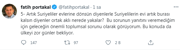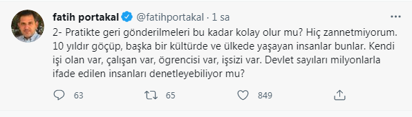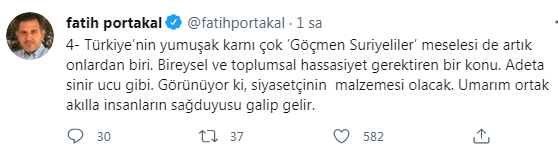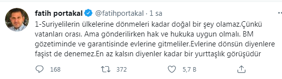 Sosyal medya hesabı Twitter üzerinden Suriyeli sığınmacılarla ilgili açıklamalarda bulunan Gazeteci Fatih Portakal, “Suriyelilerin ülkelerine dönmeleri kadar doğal bir şey olamaz. Çünkü vatanları orası. Ama gönderilirken hak ve hukuka uygun olmalı” dedi.