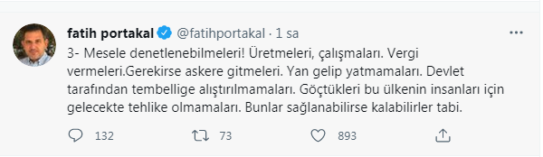 “Devlet sayıları milyonlarla ifade edilen insanları denetleyebiliyor mu?” sorusunu soran Portakal, “Mesele denetlenebilmeleri! Üretmeleri, çalışmaları. Vergi vermeleri. Gerekirse askere gitmeleri. Yan gelip yatmamaları. Devlet tarafından tembelliğe alıştırılmamaları. Göçtükleri bu ülkenin insanları için gelecekte tehlike olmamaları. Bunlar sağlanabilirse kalabilirler tabii” ifadelerini kullandı.
