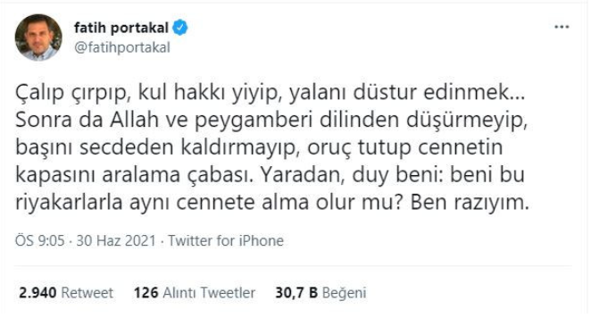 FOX TV’den ayrıldıktan sonra YouTube kanalında gazeteciliğe devam eden Fatih Portakal'ın sosyal medya hesabından yaptığı paylaşım dikkat çekti.