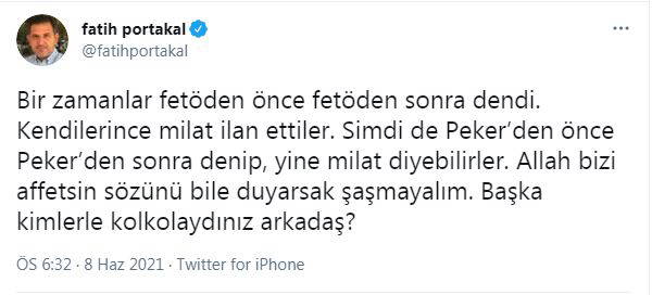 Peker yaklaşık bir aydır yayımladığı video ve sosyal medya paylaşımlarıyla gündemdeki yerini korurken gazeteci Fatih Portakal sosyal medya hesabından yaptığı paylaşımda dikkat çeken bir yorumda bulundu.