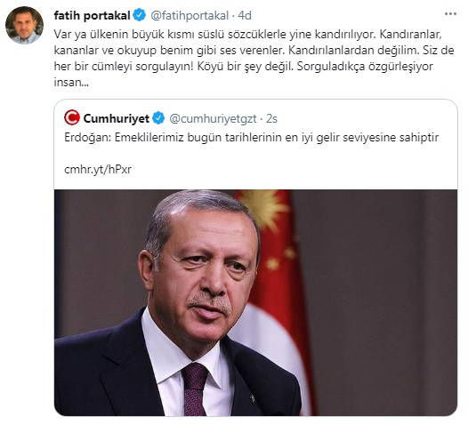 Erdoğan'ın sözlerine tepki gösteren Fatih Portakal, "Var ya ülkenin büyük kısmı süslü sözcüklerle yine kandırılıyor. Kandıranlar, kananlar ve okuyup benim gibi ses verenler. Kandırılanlardan değilim. Siz de her bir cümleyi sorgulayın! Kötü bir şey değil. Sorguladıkça özgürleşiyor insan..." ifadelerini kullandı.